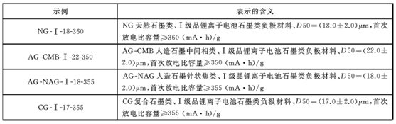 產品代號由類別代號、等級代號、D50和首次放電比容量等依次排列組成,即:類別代號-等級代號-D50-首次放電比容量,具體示例見表2。
