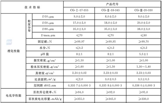 表4 典型人造石墨類鋰離子電池負極材料技術指標