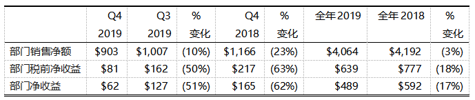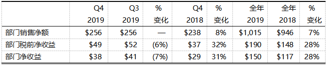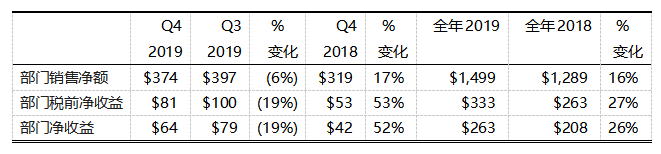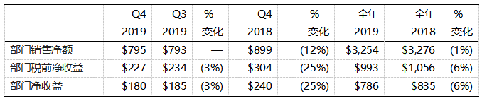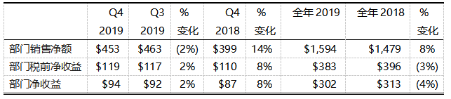 特殊材料部2019年全年銷售額符合預期。得益于創新產品的研發以及市場對高端玻璃的強勁需求,其全年銷售額同比增長8%。第四季度銷售額為4.53億美元,與2018年第四季度相比增長14%。