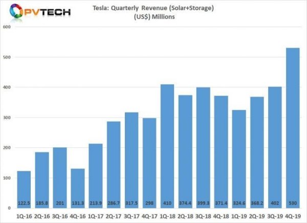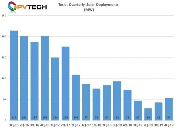 特斯拉公司日前發(fā)布了該公司2019年的全年業(yè)績(jī),表明該公司2019年部署的太陽(yáng)能裝機(jī)容量為173MW,與2017年的522MW和2018年的326MW的裝機(jī)容量相比相去甚遠(yuǎn)。