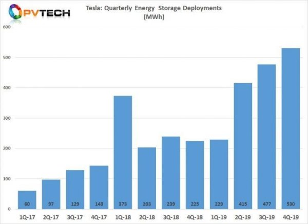 相比之下,特斯拉公司2019年的儲(chǔ)能部署情況(見(jiàn)下圖)更為樂(lè)觀。2019年第四季度部署的儲(chǔ)能系統(tǒng)容量為530MWh,創(chuàng)下季度最高記錄,而該公司2019年第一季度為229MWh,第二季度為415MWh,第三季度為477MWh。