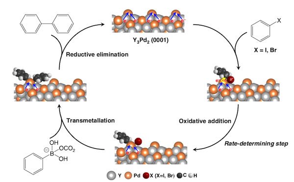 據(jù)文章第一研究作者東京理工大學元素策略材料研究中心助理教授葉天南解釋說,根據(jù)理論計算,Y3Pd2被認為是有效的選擇。他說:“在一種電子化合物中,陰離子電子被困在間隙位置,通常具有很強的電子捐贈作用。這一特征促使我們將Y3Pd2作為鈴木偶聯(lián)反應催化劑,因為決速步驟的反應勢壘可通過電子從駐極體轉移到基板來抑制。”