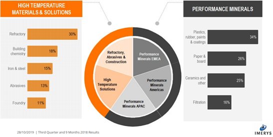 2019公司圍繞核心市場,分兩個分部進行組織:性能礦物以及高溫材料和解決方案。其中性能礦物細分市場匯集了三個地理業務領域:歐洲、中東、非洲(EMEA)、美洲和亞太(APAC),服務于塑料、油漆和涂料、過濾、陶瓷、可再生能源以及紙張和紙板市場。性能礦物包括性能添加劑、過濾、碳酸鹽、陶瓷、高嶺土、石墨和碳部門,以及膨潤土和珍珠巖中間業務部門。