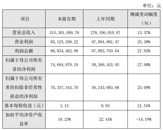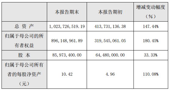 據(jù)了解,報告期內(nèi),公司實現(xiàn)營業(yè)收入 315,301,090.76 元,同比增長 13.37%;實現(xiàn)利潤總額 86,834,462.98 元,同比增長 27.92%;實現(xiàn)歸屬于母公司所有者的凈利潤 74,694,979.19 元,同比增長 27.98%;報告期末總資產(chǎn) 1,023,726,519.19元,較期初增長 147.44%;歸屬于母公司的所有者權(quán)益 896,148,961.89 元,較期初增長 180.45%。