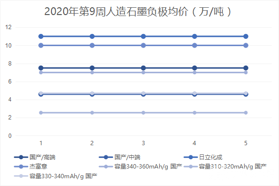 第9周人造石墨負極均價與上周持平,具體均價:高端(國產)7.5萬/噸,中端(國產)4.6萬/噸,日立化成11萬/噸,杰富意10萬/噸,容量310-320mAh/g(國產)2.55萬/噸,容量330-340mAh/g(國產)4.7萬/噸,容量340-360mAh/g(國產)7萬/噸。