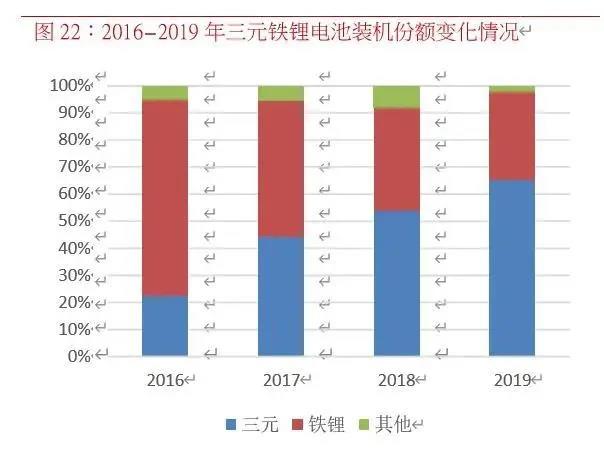 三元電池對(duì)鐵鋰電池份額的擠壓始于 2016 年,在乘用車領(lǐng)域,三元迅速取代鐵鋰,裝機(jī)份額逐漸提升。在專用車領(lǐng)域,三元的裝機(jī)量也有較大增長(zhǎng),而客車領(lǐng)域由于政策的原因,未放開三元電池配套。2019 年全年,我國(guó)動(dòng)力電池裝機(jī)量達(dá)到62GWh,乘用車裝機(jī)量 42GWh,客車裝機(jī)量14.55GWh,專用車裝機(jī)量5.4GWh,乘用車已經(jīng)成為拉動(dòng)電池裝機(jī)的主要領(lǐng)域。因此三元的份額在裝機(jī)總量中快速提升,達(dá)到 40GWh,裝機(jī)份額65%,較 18 年增加10GWh;而鐵鋰電池的裝機(jī)量?jī)H 20GWh,裝機(jī)量連續(xù)三年出現(xiàn)增長(zhǎng)瓶頸,裝機(jī)份額下降至32%。