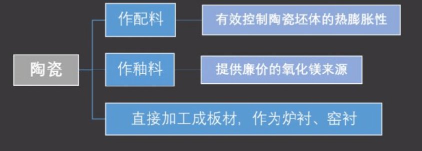 涂料中,滑石在極性和非極性基質中均能較好地分散,同時具有化學惰性和較高的吸油率;紡織業,用作紡織品的填充和增白劑、潤滑劑;化妝品中,被應用到各種潤膚粉、美容粉、爽身粉等;醫藥、食品中,用于制作醫藥片劑、糖衣、痱子粉、中藥方劑、食品添加劑、隔離劑等;其他農藥及化肥的載體、工藝美術品、脫模劑、防水油膏等,也有滑石的參與。