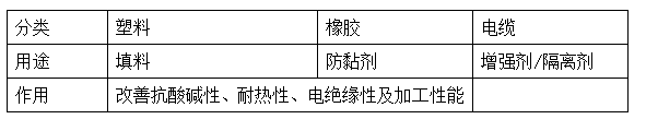 化工:化工工業塑料、噴漆業去毒、橡膠填料等;