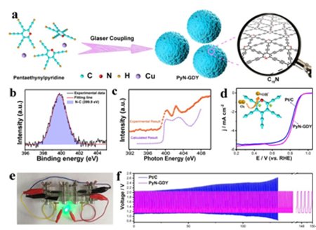 圖:吡啶石墨炔的合成方法、X射線光電子能譜、X射線吸收光譜以及電催化性能和鋅-空電池性能表征。