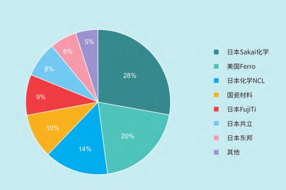 在先進陶瓷工藝中,粉體制備是最核心的技術之一。高純、超細、高性能陶瓷粉體制造技術是制約我國先進電子陶瓷產業發展的主要瓶頸。全球約65%的電子陶瓷粉被日本企業壟斷,日本Sakai是全球最大的電子陶瓷粉體材料生產商,全球市場份額約28%,其次是美國Ferro 及日本化學NCI,分別占比約28%、14%。