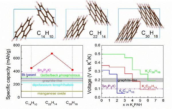 苯乙烯材料(上)在嵌入鉀時的理論比容量(左下)和開路電壓(右下)與其它材料的對比