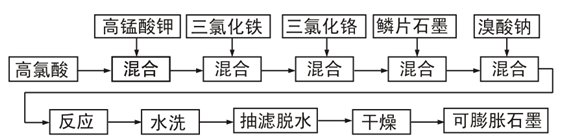 化學氧化法是一種制備可膨脹石墨的傳統方法,此法將天然鱗片石墨與適量的氧化劑和插層劑均勻混合,控制一定的溫度,不斷攪拌,經水洗、過濾、烘干即得到可膨脹石墨。化學氧化法以設備簡單、操作方便、成本低等優點成為工業上應用相對較多和較成熟的方法。