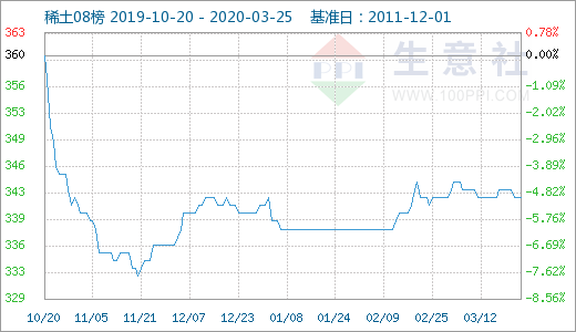 中國粉體網(wǎng)訊 3月24日稀土指數(shù)為342點,與昨日持平,較周期內(nèi)最高點1000點(2011-12-06)下降了65.80%,較2015年09月13日最低點271點上漲了26.20%。(注:周期指2011-12-01至今)。