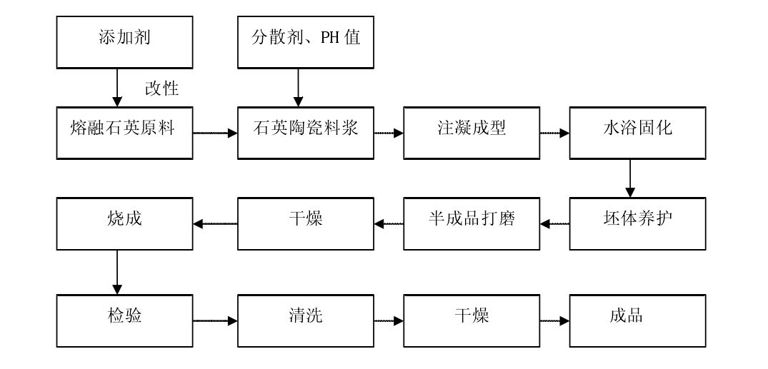 目前,熔融石英陶瓷的成型工藝有注漿成型、注凝成型、等靜壓成型、離心澆注成型、澆灌成型、蠟注成型、半干法成型、熱壓成型等,其中工業上最常用的是注漿成型和注凝成型。