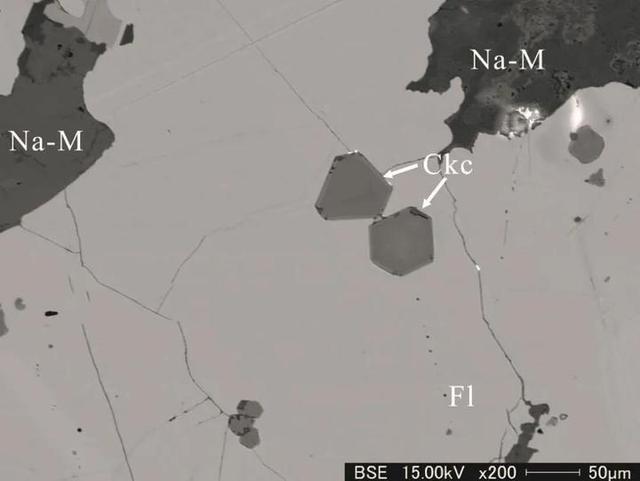 竺可楨石的背散射電子像(Ckc-竺可楨石;Fl-螢石;Na-M-鈉云母)