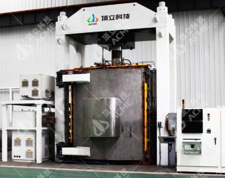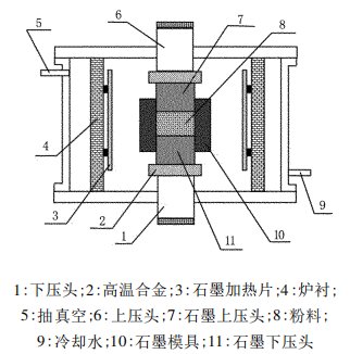 熱壓燒結工藝需要專用的熱壓燒結爐,常用的熱壓燒結爐主要由加熱爐、加壓裝置、模具和測量測壓裝置組成。熱壓燒結爐的工作原理是:將混合粉料裝入石墨模具中,通過石墨加熱片加熱粉料。加熱到一定溫度后,上下壓頭帶動石墨上壓頭和石墨下壓頭對模具內粉料施加壓力,實現燒結壓制同步進行,使粉料在高溫高壓下達到致密化燒結。