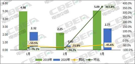 動力電池應用分會研究部統計的整車合格證數據顯示,2020年一季度國內新能源汽車產量達11.23萬輛,同比下降57.2%;搭載的動力電池裝機量約5.68GWh,同比下降53.8%。其中,3月份新能源汽車產量5.18萬輛,同比下降51.8%,環比增長335.0%;搭載的動力電池裝機量約2.77GWh,同比下降45.6%,環比增長363.8%。