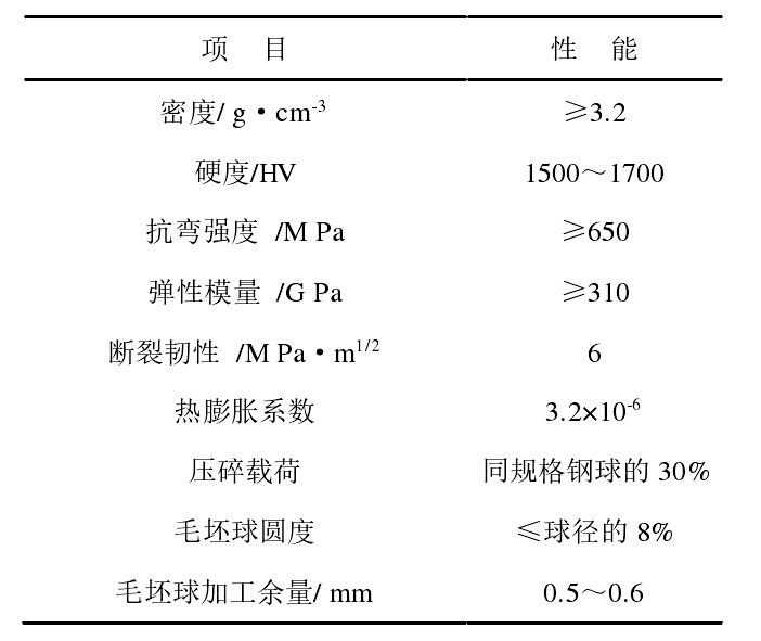 工程陶瓷根據元素組成的不同分為氮化物陶瓷、氧化物陶瓷、碳化物陶瓷等。從目前陶瓷球軸承的研究和實際應用情況來看,氮化硅是最適合用來制造滾動軸承的陶瓷材料,其優點主要表現在低密度、中等彈性模量、低熱膨脹系數和優良內在化學特性,其毛坯球力學性能如下表所示。