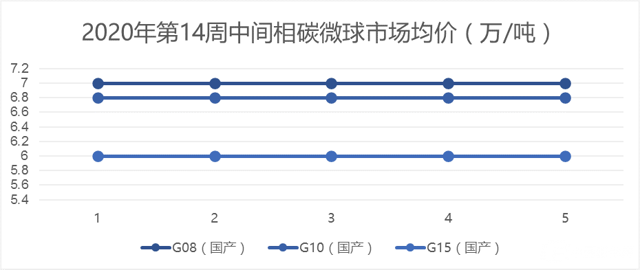 第14周中間相碳微球市場(chǎng)報(bào)價(jià)與上周價(jià)格持平,具體均價(jià):G08(國(guó)產(chǎn))均價(jià)7萬(wàn)/噸,G10(國(guó)產(chǎn))均價(jià)6.8萬(wàn)/噸,G15(國(guó)產(chǎn))均價(jià)6萬(wàn)/噸。