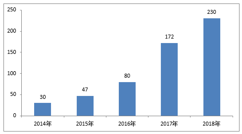 2014-2018年中國三元正極材料市場規(guī)模(單位:億元)