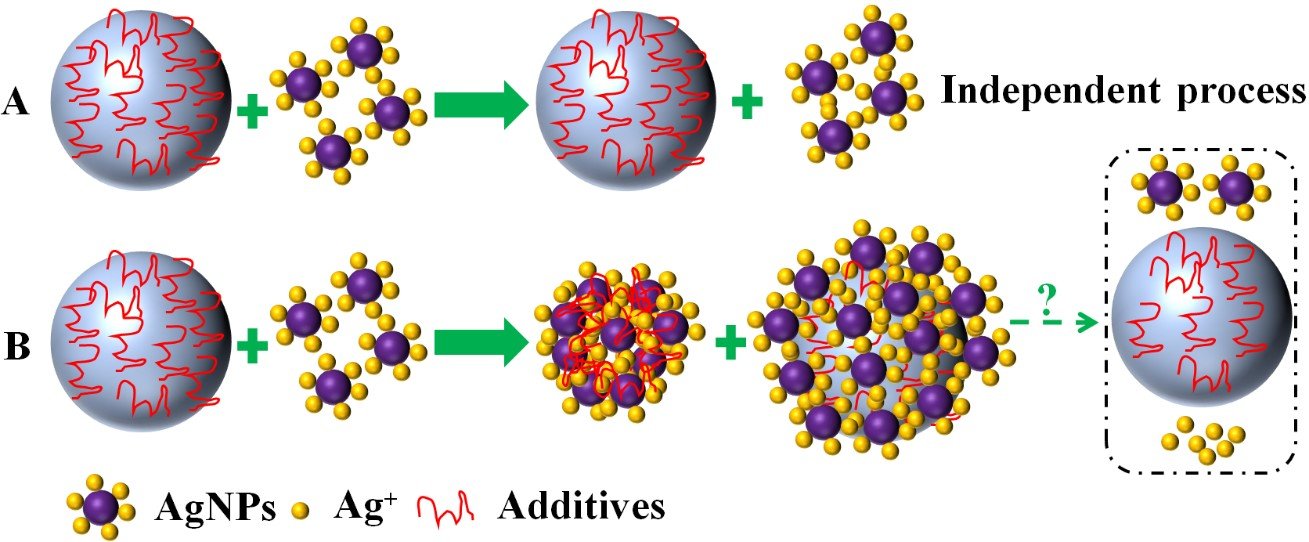 鑒于此,中國科學院城市環境研究所環境安全監測研究組(張洪武團隊),選取聚乙烯(PE)、聚丙烯(PP)和聚苯乙烯(PS)三種環境中常見的微塑料為研究對象,初步探索了微塑料和AgNPs在水體中的相互作用。結果表明,AgNPs與PE或PP微塑料之間沒有顯著的相互作用,能夠在水體中共存。然而,PS微塑料可以以單分散顆粒的形式有效地捕獲水體中的AgNPs,形成AgNPs-PS復合物,可能是AgNPs在水環境中一種新的環境行為。該成果為研究納米銀的環境行為提供了新思路,也為納米銀的去除呈現了一種潛在的新方法。該研究首次揭示了微塑料能夠捕獲水體中的AgNPs,促進了目前對納米顆粒與微塑料這兩種新興污染物在水生環境中相互作用的理解。