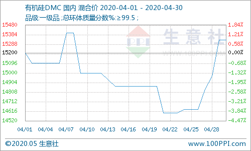 產品:4月初開始,有機硅市場依舊弱勢運行為主,市場需要提升不足,當時有機硅DMC市場均價在15200元/噸附近,高端報價在15500元/噸,低端報價在14200元/噸左右,持續多日的低位運行使得廠家前期部分庫存得以消化,清明節后,市場出現漲價聲音,部分低端報價紛紛調高DMC出廠價格,其中魯西化工調整幅度較大,此前低端報價在14300元.噸附近,清明節后7日,報價上調至15200元/噸附近,根據生意社數據監測顯示,7日,有機硅DMC市場參考出廠均價升至15400元/噸。由于終端市場需求量依舊未能全部釋放,下游按需購入,囤貨心態較弱,市場觀望為主,高價暫穩幾日后,部分廠家不堪庫存壓力,再次下調DMC出廠報價,下調幅度更甚月初,低端報價再次重回市場,價格博弈屢屢出現,截止4月22日,根據生意社數據監測顯示,有機硅DMC出廠參考均價已跌至14600元/噸,低端報價已至13900-14100元/噸。月末即將到來之時,受下游硅酮膠市場小幅回暖影響,部分低端廠家小幅上調DMC出廠報價100-200元/噸,但對整體市場并未帶動深遠影響,廠家心態已在瓦解邊緣,月末停產限產計劃陸續出爐,DMC市場終于在月底迎來反擊,27日市場開始出現觸底反彈,整體勢頭較為明顯,廠家最大提漲幅度在1000元/噸,30日,根據生意社數據監測顯示,有機硅DMC市場出廠均價回調至15300元/噸附近。至此,整個4月,有機硅DMC市場行情雖再遇低谷,但好在月末重新回調,市場與月初相比暫穩運行。