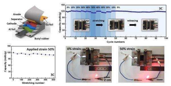 韓國科學技術研究院(KIST)的科學家在開發此類鋰離子電池時考慮到了此類應用,其組件可拉伸至多50%,而不會影響安全性或性能。