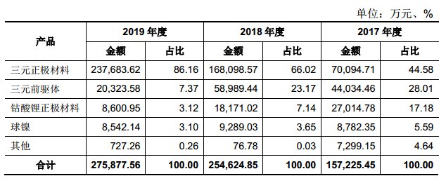 2017 年、 2018 年和 2019 年,公司主營業(yè)務(wù)毛利率分別為 20.98%、 15.17%和17.14%,呈現(xiàn)波動趨勢。公司主要業(yè)務(wù)收入集中在三元正極材料和三元前驅(qū)體,兩者占比達(dá)72.59%。