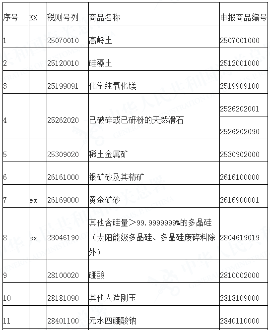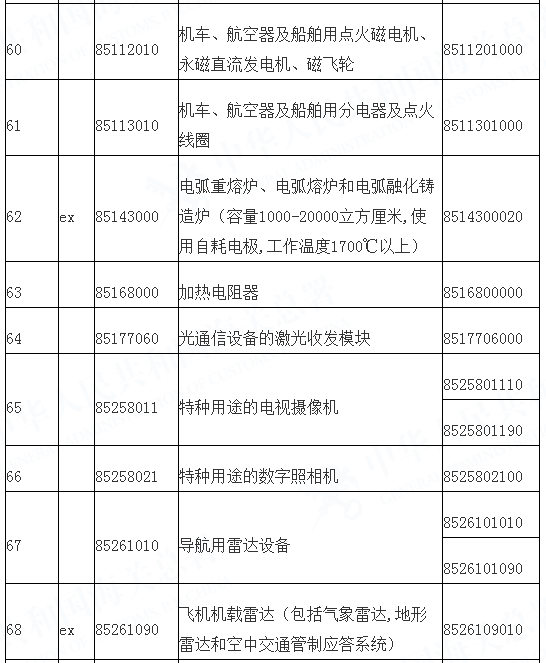 其中涉及第五類的高嶺土、稀土礦、銀礦砂、黃金礦砂等礦產品7項,第二十八章無機化學品、第二十九章有機化學品和第三十八章雜項化學品等化學品27項,第十一類的無紡織物和工業用紡織制品4項,第十三類金剛石、石墨制品、陶瓷制品和玻璃等6項,第十五類的賤金屬制品9項,第八十五章電動機、發電機、通信模塊、雷達設備、信號發生器等商品26項。