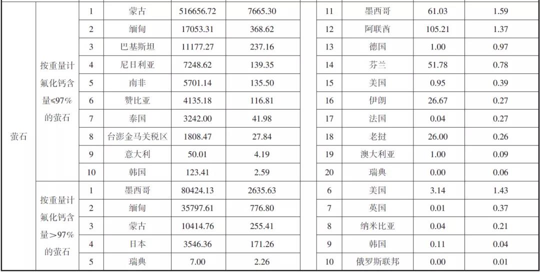 2019年我國螢石進(jìn)口總量為69.77萬噸,進(jìn)口額12588.9萬美元;其中按重量計氟化鈣含量在97%及以下的螢石進(jìn)口量56.75萬噸,進(jìn)口額8745.48萬美元;按重量計氟化鈣含量在97%以上的螢石進(jìn)口量13.02萬噸,進(jìn)口額3843.41萬美元。