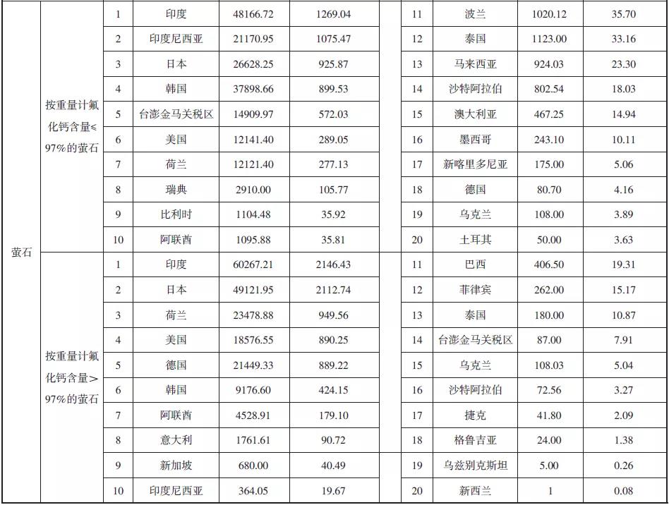 2019年我國螢石出口情況——按國家統(tǒng)計