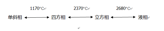 ZrO2有三種晶體結構,單斜相(常溫穩定型,密度5.68g/cm3)、四方相(密度6.1g/cm3)、立方相(密度6.27g/cm3)。三種晶型可以相互轉變,轉變溫度與雜質含量有關,在ZrO2純度高時,三種晶型能發生以下同質異晶轉變: