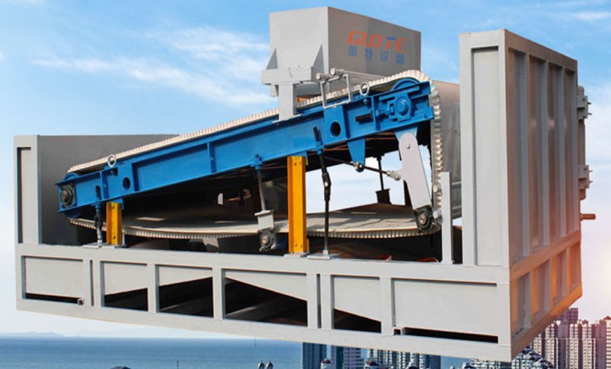 礦漿通過入料管道進(jìn)入磁選機(jī)布料器,經(jīng)過均勻分散后散落在磁板上部的卸鐵皮帶上。礦漿在重力作用下沿磁板的傾斜方向向下流動(dòng),礦漿中的鐵磁物在磁板強(qiáng)大的磁場(chǎng)力作用下被牢牢吸附在卸鐵皮帶上,卸鐵皮帶在電機(jī)帶動(dòng)下沿磁板傾斜的上方轉(zhuǎn)動(dòng),同時(shí)將吸附的鐵磁性物帶入卸鐵區(qū)。鐵磁性物在沖洗水的沖洗下進(jìn)入尾礦斗被收集,無磁性礦漿沿磁板向下流動(dòng),流入礦斗。