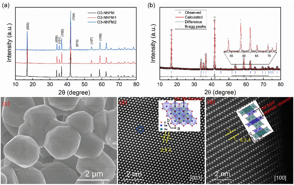圖1.(a)系列O3-Na[NixFeyMn1-x-y]O2 (x=0.6、0.7和0.8分別對應O3-NNFM、O3-NNFM1和O3-NNFM2)樣品的XRD圖譜,(b-e)O3-Na[Ni0.60Fe0.25Mn0.15]O2的XRD圖譜精修、SEM和STEM表征