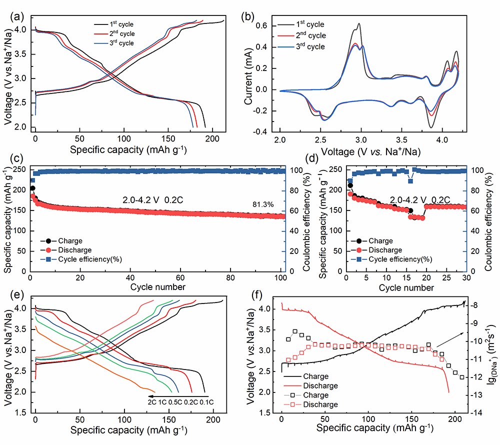 圖2. O3-NNFM電極在2.0-4.2 V電壓范圍內的(a)前三周充放電曲線,(b)CV曲線,(c)循環性能,(d)和(e)倍率性能