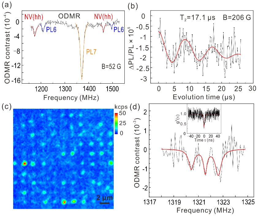 圖(a) 碳化硅NV色心系綜的室溫光探測磁共振譜, (b) 碳化硅NV色心系綜的室溫自旋回波, (c) 碳化硅材料中單NV色心陣列的熒光成像圖, (d) 單個NV色心的光探測磁共振譜(插圖是單個NV色心發光的二階關聯函數,展示了單光子發光特性)。