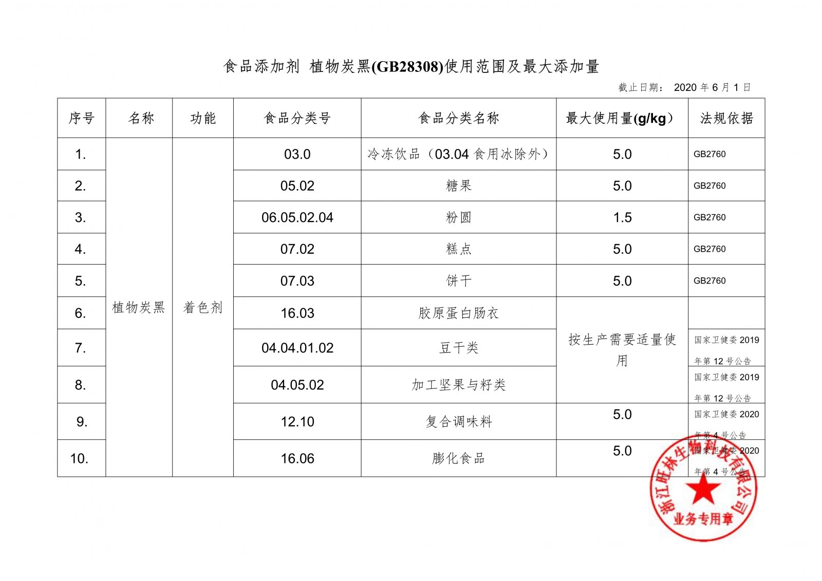 截止2020年6月1日, 植物炭黑使用范圍及最大添加量如下表: