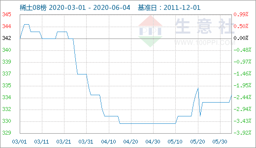 近期國內輕稀土市場價格觸底反彈,鐠釹氧化物及鐠釹合金價格連續走高,輕稀土市場迎來“春天”。根據生意社稀土板塊指數顯示,6月4日稀土指數為334點,較昨日上升了1點,較周期內最高點1000點(2011-12-06)下降了66.60%,較2015年09月13日最低點271點上漲了23.25%。(注:周期指2011-12-01至今)。