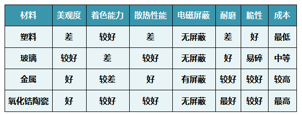 智能手機蓋板是氧化鋯的重要應用市場,隨著5G商用,智能手機背板材料更新換代。智能手機蓋板材料主要有塑料、金屬、玻璃等,其中,塑料蓋板性能較差,現階段主要應用于低端手機領域,且逐漸被市場淘汰;金屬和玻璃蓋板都擁有獨特的優點,氧化鋯陶瓷蓋板結合了玻璃和金屬材料的優點,具有美觀度高、無信號屏蔽、硬度高、散熱性好、耐磨性強等優點,成為優異的新型手機蓋板材料。
