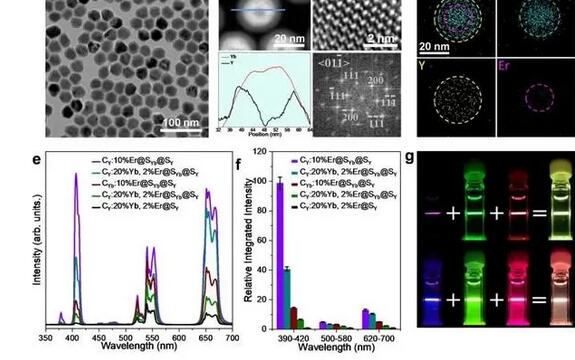圖2. 核-殼-殼納米顆粒的電鏡表征和顯著增強(qiáng)的多光子上轉(zhuǎn)換發(fā)光