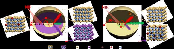 圖1. NaYF4:Er@NaYbF4@NaYF4 核-殼-殼納米顆粒的結(jié)構(gòu)(a)和傳統(tǒng)NaYF4:Yb, Er@NaYF4 共摻雜核-殼納米顆粒的結(jié)構(gòu)(b)示意圖