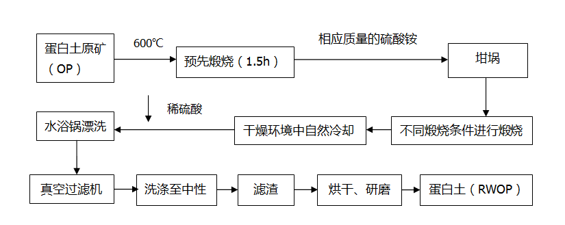 劉陽鈺等在《蛋白土硫酸銨煅燒增白工藝研究》一文中,首次采用預先煅燒的方法去除蛋白土中有機雜質并將其中所含有的鐵元素轉化為Fe2O3,然后采用硫酸銨煅燒法來增白預先煅燒后的蛋白土。