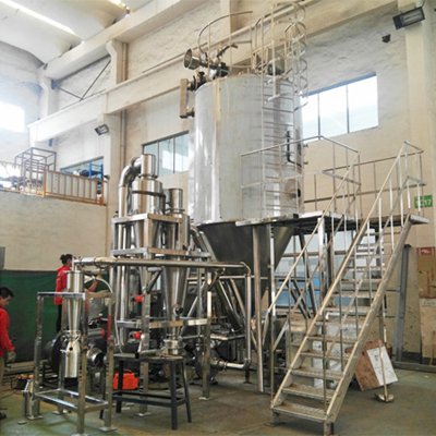 中藥浸膏是由植物根莖葉提取而成,特別是醇提工藝,它含糖份較高,在高溫下易軟化熔融,普通的離心噴霧已無法滿足干燥,針對這種情況我公司組織了一批精干的技術力量,總結出幾年來本廠設計制造噴霧干燥機的成功經驗,收集了國內外同行業同類型產品的優點,經過精密、反復的工藝計算和無數次的實驗,開發出了中藥專用噴霧干燥機組,并推廣到了一些知名藥廠使用。