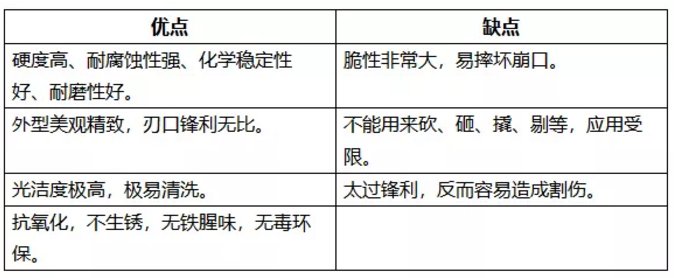現(xiàn)代廚房用陶瓷刀具大多采用高純超細(xì)氧化鋯為原料,經(jīng)噴霧造粒、等靜壓成形、精密加工等多種工序制造而成,它的優(yōu)點(diǎn)和缺點(diǎn)都非常明顯,它既可以鋒利無比,吹毛斷發(fā),同時(shí)也擁有陶瓷脆性大的缺點(diǎn)。