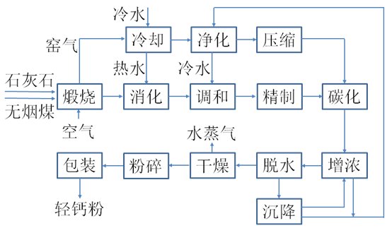 輕質(zhì)碳酸鈣又稱沉淀碳酸鈣(PCC),是利用化學(xué)方法制得。通常是將石灰石等原料鍛燒生成生石灰(主要成份為氧化鈣)和二氧化碳,再加水消化石灰生成石灰乳(主要成份為氫氧化鈣),然后再通入二氧化碳碳化石灰乳生成碳酸鈣沉淀,最后碳酸鈣沉淀經(jīng)脫水、干燥和粉碎便制得輕質(zhì)碳酸鈣。