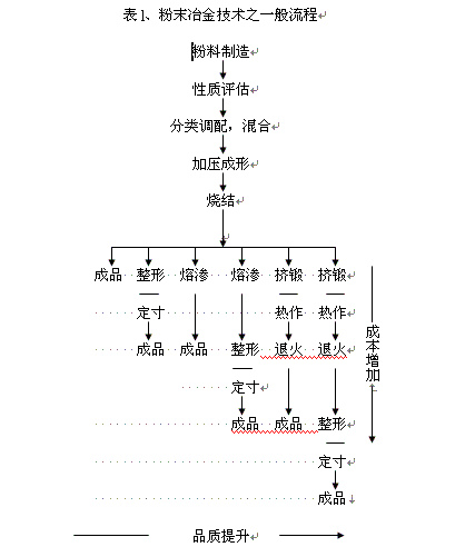粉末冶金技術(shù)之一般流程如表l所示: