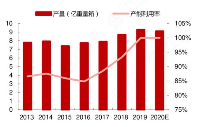 在最保守的情況下,假設5月即為玻璃在產產能的年內低點,此后逐月線性增長,到12月達到9.06億重箱,則可以得到全年平均在產產能約為9.1億重箱,比2019年下降1.9%。從近幾年來看,玻璃行業平均產能利用率較高,預計20年產能利用率與19年持平,對應產量9.1億重箱,YOY-1.9%。