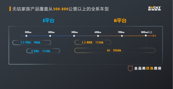 蜂巢能源H平臺和E平臺所生產的無鈷電芯,對應的是不同的車型定位市場,覆蓋從300-800公里以上的全系車型,可實現從微型車到全尺寸車型上的應用,官方宣稱支持全品類終身質保。