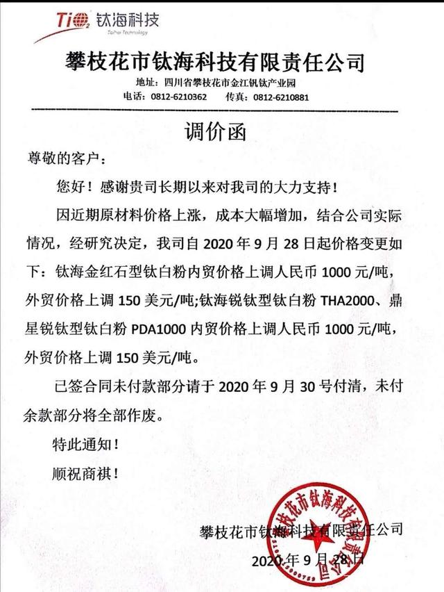 中國粉體網(wǎng)訊 2020年9月28日,攀枝花鈦海科技有限責(zé)任公司發(fā)布鈦白粉調(diào)價函通知。基于當(dāng)前的原材料價格上漲,成本大幅度增加,結(jié)合公司實際情況,經(jīng)公司研究決定,自即日起,公司鈦海金紅石型鈦白粉國內(nèi)價格上調(diào)1000元/噸,國外價格上調(diào)150美元/噸。鈦海銳鈦型鈦白粉THA2000、鼎星銳鈦型鈦白粉PDA1000國內(nèi)價格1000元/噸,國外價格上調(diào)150美元/噸。