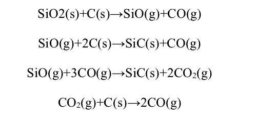 碳熱還原反應(yīng)燒結(jié)主要使用適量的硅源和碳作為原料均勻混合,均勻涂覆在支撐體上,再在氬氣氣氛或真空環(huán)境保護下進行碳熱還原反應(yīng),以二氧化硅作硅源為例,其中反應(yīng)主要有:
